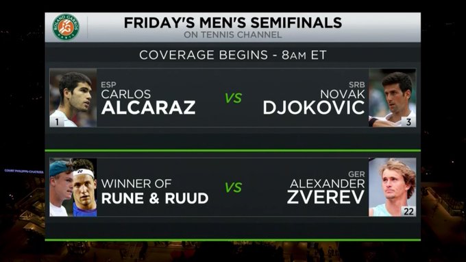 Ruud and Zverez are the second match tomorrow. The first semi starts at 745am CT