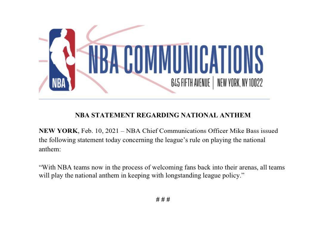 The NBA issued the following statement concerning the league’s rule on playing the national anthem: