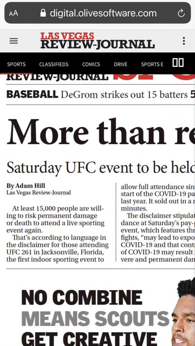 "Hey Las Vegas, this is our piece of shite local newspaper. Through this entire pandemic we didn't lay off a single employee, we worked with governmental agencies in Nevada and around the world to put on every event safely, and we chose to bring our biggest fight of the year with Conor McGregor back to town July 10th to help relaunch the city. Yet, this is how the Las Vegas Review Journal shows its support for a true local business. Go frick yourself LVRJ, and don't bother coming to the fight in July."