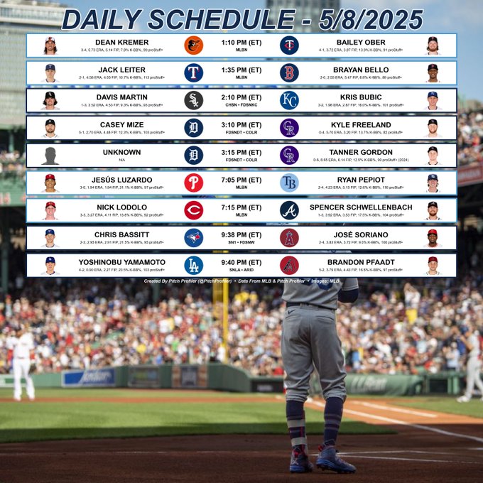 Lighter slate today. Rubber matches in both the Rangers/Red Sox and Reds/Braves series, and what seems like the first NL West on West series of the season yet with the Dodgers going from Miami to PHX to start a 4 gamer.