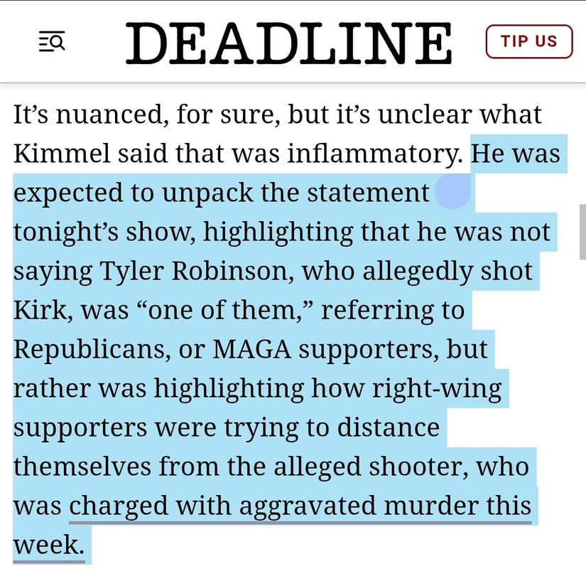 re: ABC pulls 'Jimmy Kimmel Live' off air 'indefintely' over Charlie Kirk comments