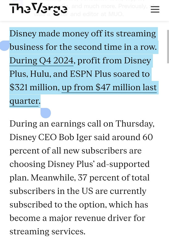 As I said in my post, I am not hoping for a Disney failure. If you look at what you posted, it doesn't say D+ was a money maker. It says that D+, HULU and ESPN+ combined made money. D+ is losing subscribers, which has been a continuing trend.