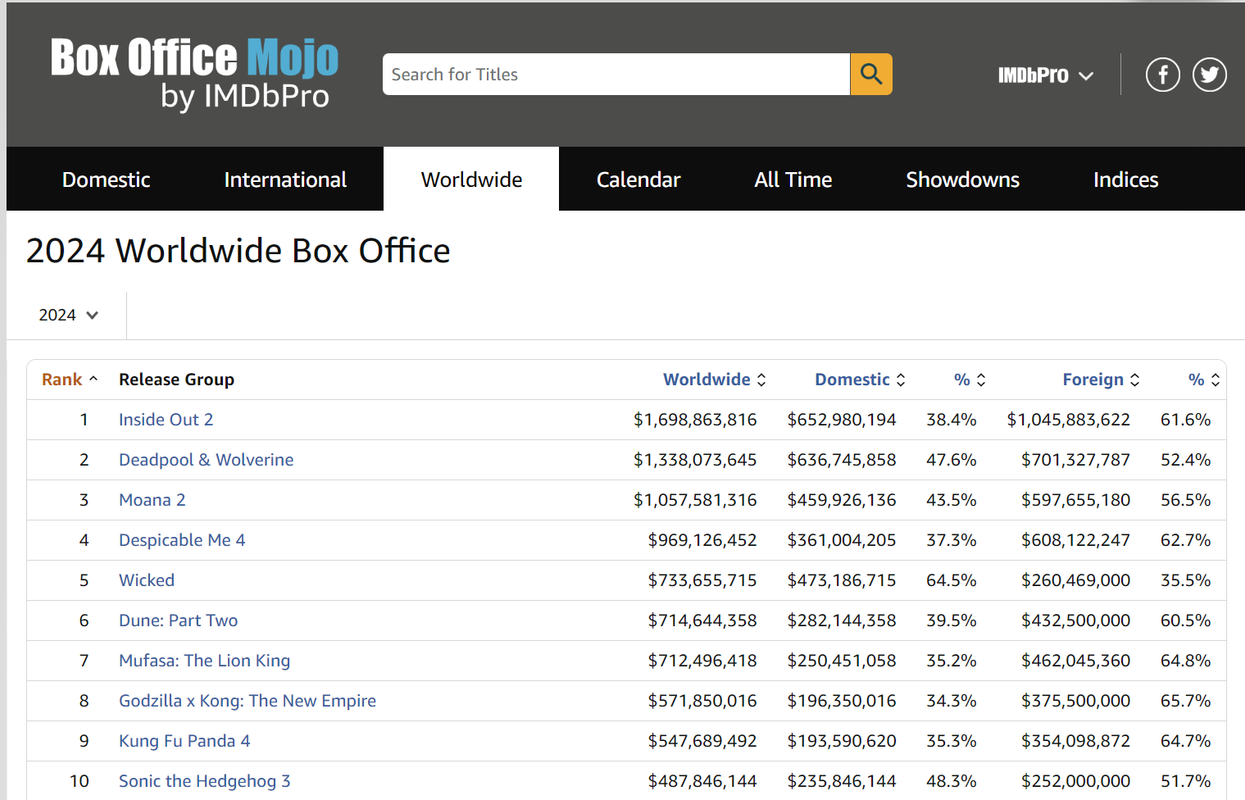 So, no major studios can claim successes? Besides Universal for Wicked? Oh, and Disney, for the #3 #7 films you left off, Moana and Mufasa, developed fully in-house.