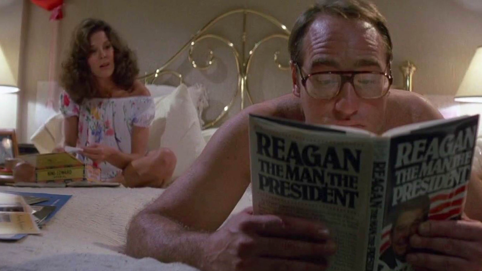Dad is reading a book about Reagan while mom is rolling a j behind him.