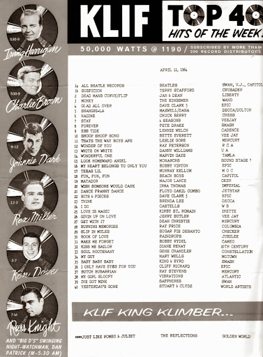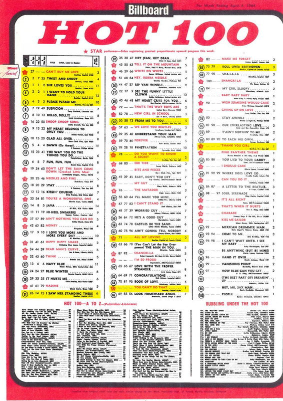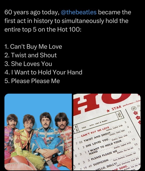 The songs in the top five were “Please Please Me” at #5, “I Want to Hold Your Hand” at #4, “She Loves You” at #3, “Twist and Shout” at #2 and “Can’t Buy Me Love” at #1.