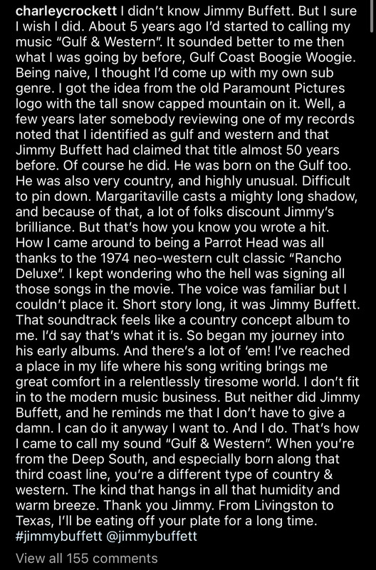 It was a relatable down-on-your-luck breakup tune, and probably opened the ears of many fans. Hopefully they kept digging into the Americana, Gulf and Western stuff… and for any of y’all that follow Charley Crockett on social media, he did a helllll of a write up on Buffett, using that term Gulf and Western.