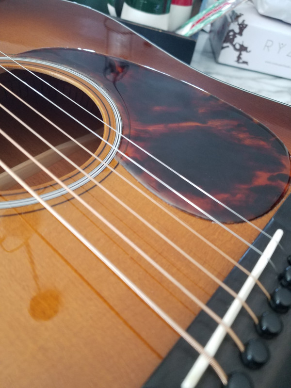 Now onto my pickguard. The 1970’s d35 had the thick solid black pickguard. They always potato chip up and need replacement. Mine is no different. But another homemade jobs done not tht long ago it appears. Also used a crappy 5 buck pickguard precut in China probably. You can see a “tan line” and the radius of the guard does not match the rosette.