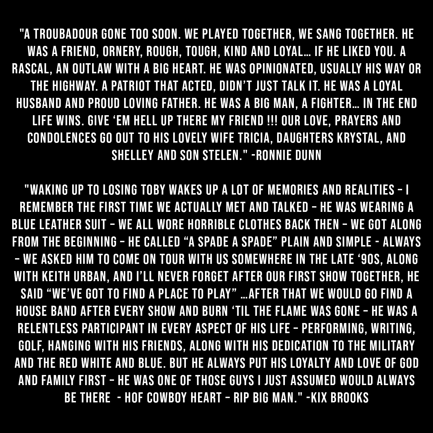 Even though I knew about your battle these last few months I still never imagined this day. Anyone who knew you knows what I mean. You were the toughest man I ever met. Thank you brother for being a friend, a hero and an inspiration. There will never be another Toby Keith.