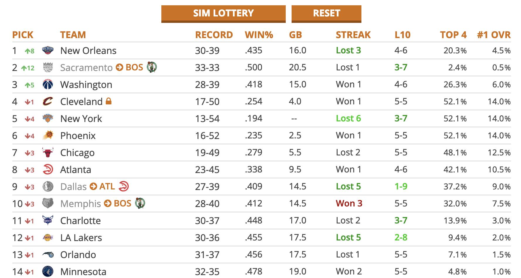 Assuming Jrue gets shut down for the rest of the season, I think we end up with a worse record than MEM, WAS, CHA, ORL, and MIN. Lakers will be interesting, but I think the media will hold Lebron's feet to the fire just enough for us to edge them out.