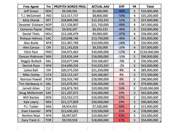 FREE AGENCY: Using a blend of @profitxai and @johnhollinger contract analytics, here's how newly-inked deals compare to their projections: Below AAV projection = blue! Above AAV projection = red!