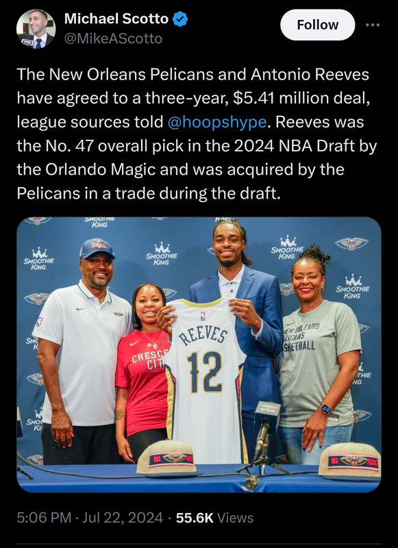 Pels signing reeves to a 3 year 5.1 mil deal