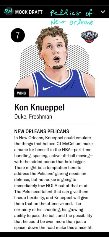 Those people trying to compare Kon to Kispert are just lazy because they are both white and can shoot the 3. Kon is a much more aggressive defender than Kispert and he's also a much better passer and is great running the pick and roll. A better comparison to Kon might be not be for the youngins in here (I’m not old myself but I’m not 19 still either) but I see Chris Mullin when I look at Kon and anyone that wouldn't want a guy like Chris Mullin on their team should go watch some highlights of him. He would be a perfect role player to pair with Zion and Trey. If we wanted to go to a small ball lineup that can shoot around Zion you could play Zion, Trey, Kon, CJ and Karlo as an athletic small ball 5. You could also use Olynyk at center and sub Herb for CJ if you wanted a little more defense.
