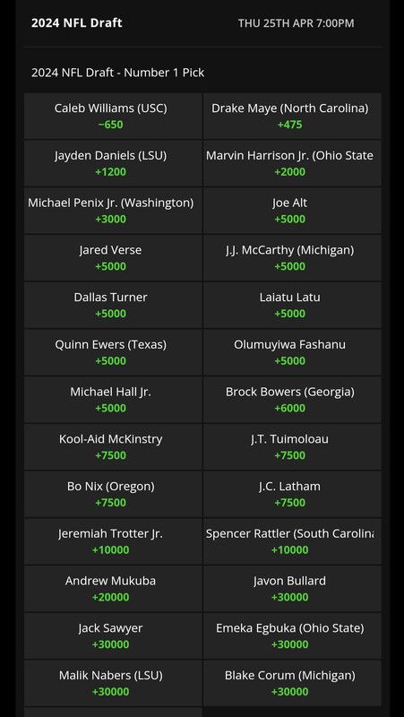 Caleb Williams will go #1 overall. He's a HUGE vegas favorite to do so