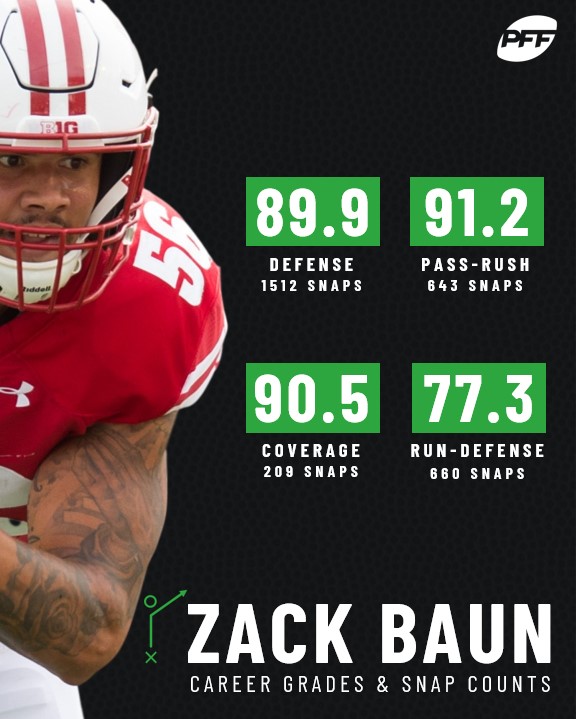 SUMMARY: A two-year starter at Wisconsin, Baun was an outside linebacker for defensive coordinator Jim Leonard in the Badgers’ 3-4 base scheme, playing mostly to the field side and switching between a rusher and dropper. Despite his sack production in college, he will be an off-ball linebacker in the NFL and defensive play callers will need to be creative with how they allow him to rush. A fantastic space athlete, Baun has the natural burst and loose hips to be deployed across the formation, handling open-field responsibilities. He consistently affects the game with his active play style and effort, but he rushes and covers more on instinct than technical know-how right now. Overall, Baun’s evaluation requires some projection because he won’t be a full-time rusher in the NFL, but he displays the fluid athleticism, smarts and motor to line up as a stack linebacker and nickel pass rusher, projecting as a top-40 prospect.