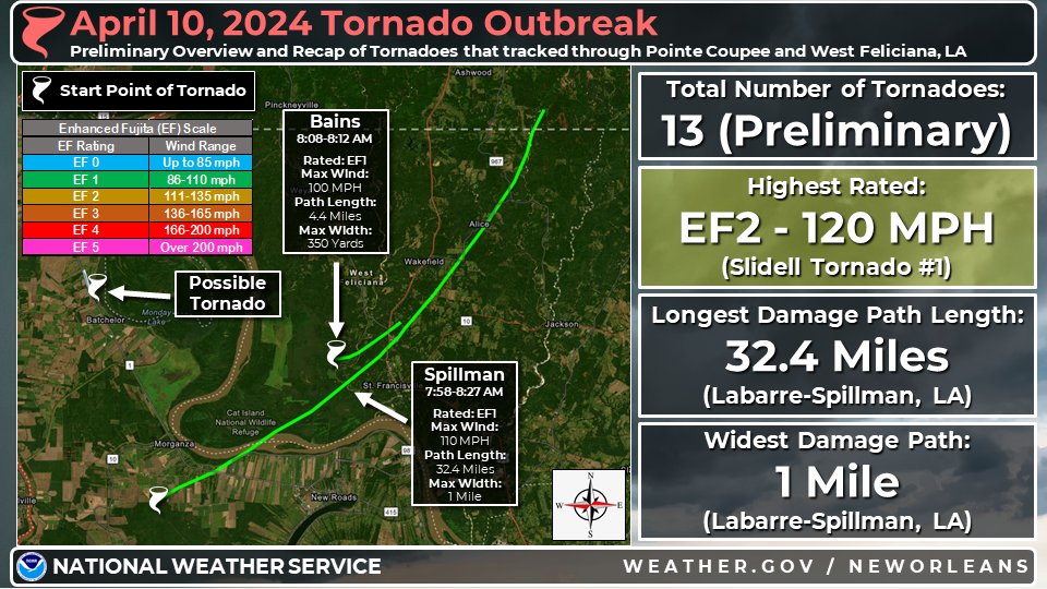 One near New Roads, and another just north of St. Francisville near the high school. Both featured winds around 100-110 mph.