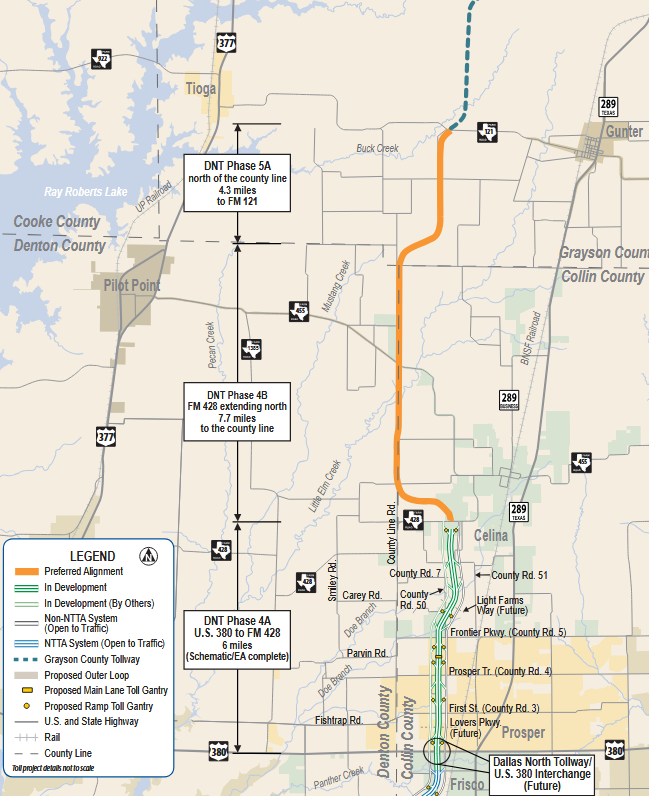 There is a gap still between Celina and Gunter, it is going to depend when they get DNT moving north of Celina. They are still mostly service roads from 380 to Celina. There is also the drama in Gunter around the BNSF expanded train yard.