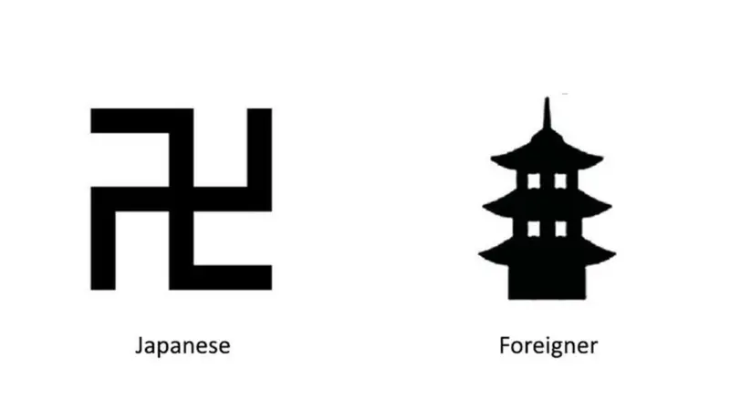 Japan's official map-making body said foreigners might mistake it for a Nazi symbol, and that temples should be represented by a three-storey pagoda instead.