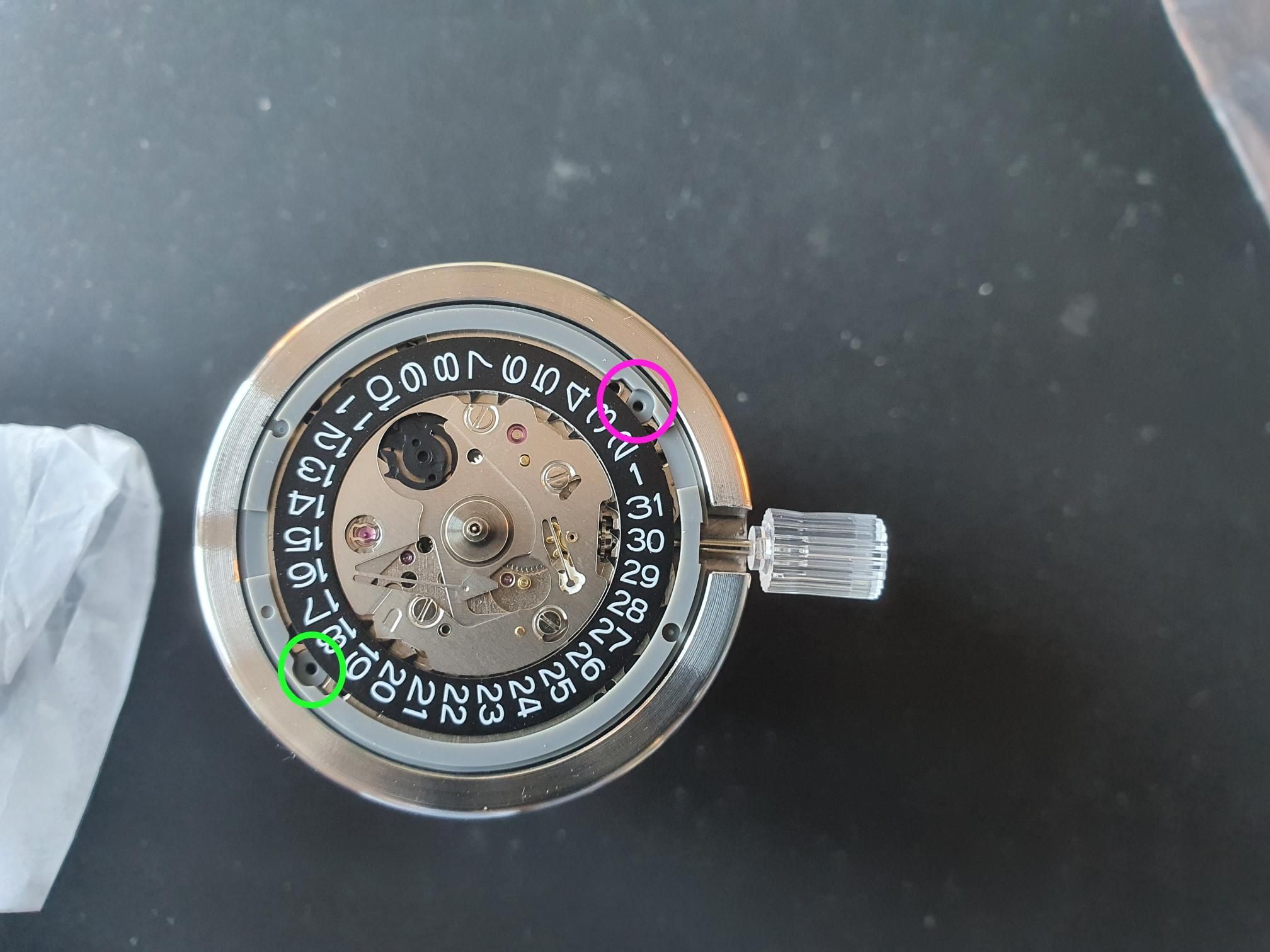 Now you have the movement sitting on the work surface get out your dial. Turn the dial over and you will see either 3 or 4 dial feet. Small brass rods soldered to the dial back. If it is a dial sold to fit the NH35 and there are oly 2 feet you can skip the next part. If it has 4 feet is is designed to fit 2 different movements (often the NH3X and Citizen 8XXX series. If it has 4 feet you need to identify which ones you need to remove and remove them. Look on the movement and identify the dial feet holes