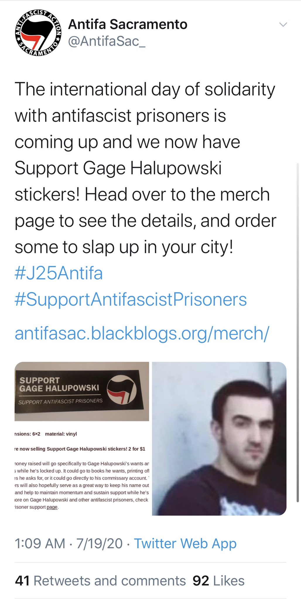 The Sacramento cell of antifa, part of a network of violent militant antifa groups in US, has created merchandise & propaganda in support of Gage Halupowski. The man is one of the few antifa convicted for assault in Portland. He nearly killed Adam Kelly in an unprovoked beating.