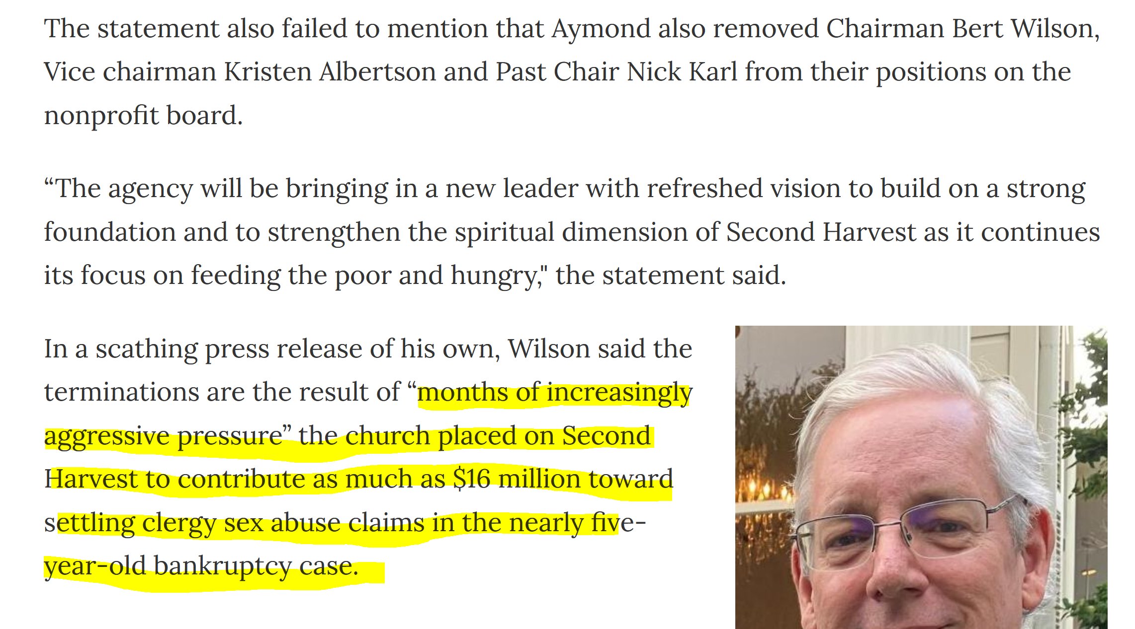 Archbishop fires board of Second Harvest for not diverting money to pay for pedophiles.