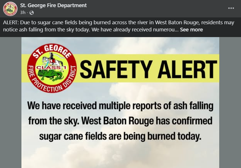 Cane fields are burned post-harvest in Louisiana, not that this will make any difference.