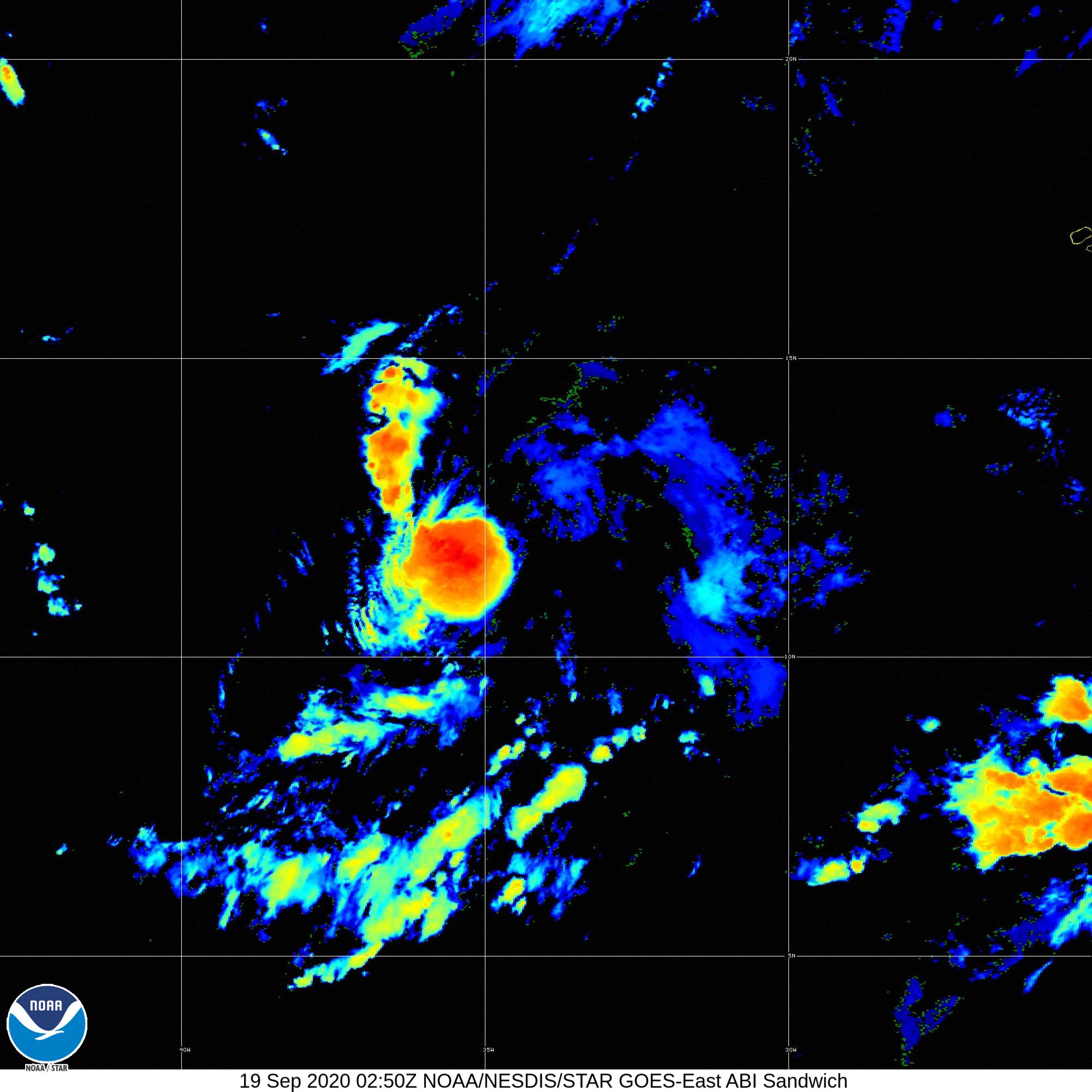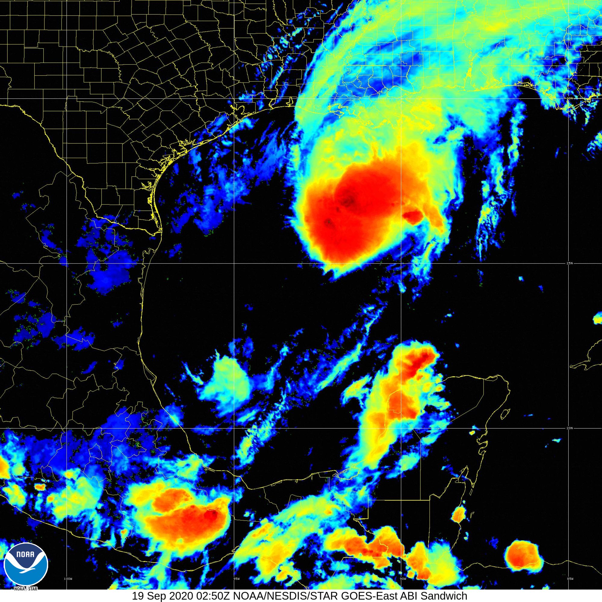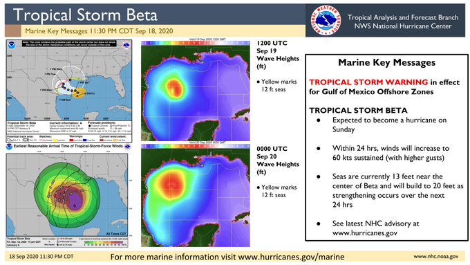 [11:45pm CDT Sep 18] Tropical Storm #Beta has strengthened to 50kt sustained winds, and is expected to become a hurricane on Sunday. Seas will build to 20ft over the next 24hrs.