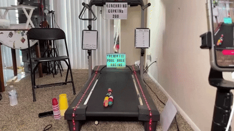 Then you set the plane on the treadmill, and turn the treadmill on. The treadmill starts and the plane rides the treadmill right off the back. You realize you need to hold the airplane in place with your hand while the propeller is not spinning or else it will ride off the back of the treadmill, even though it is on wheels. The hot wheel car also rides off the back just like this even though it has wheels.