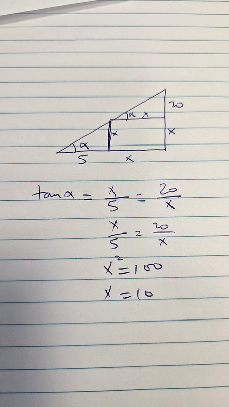The tangent of the smaller triangle is X/5. The tangent of the bigger triangle is 20/X.