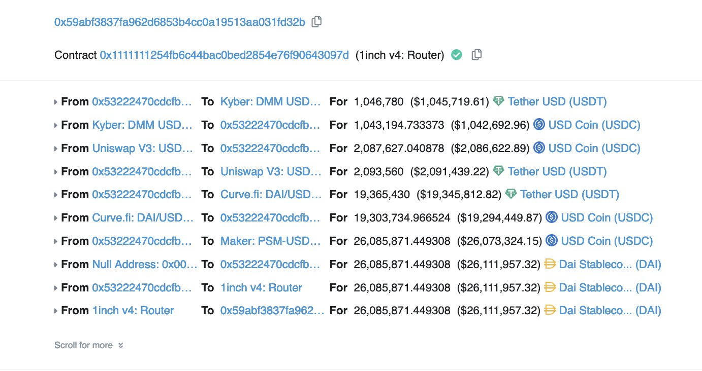 Hundreds of millions of dollars are now flowing out of FTX wallets, some speculate liquidators but it's late on a friday night, not typical times for such rapid heavy movements. Some withdrawals are being swapped from Tether to DAI. Hack or insider actions? $26 million here
