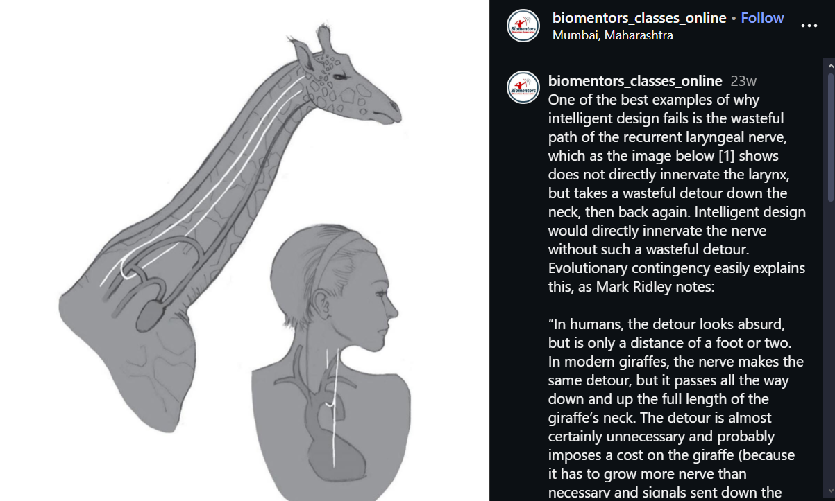 there's nothing intelligent about the nerve in a giraffes neck looping around it's heart. It's like that because the neck evolved to be longer after the nerve was already positioned that way