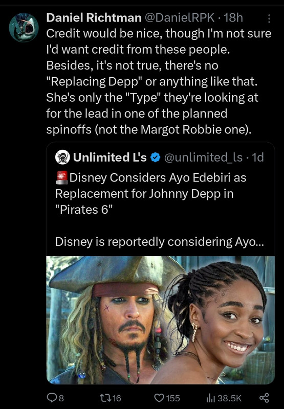 As per his sources, which have proven to be credible quite often, Ayo Edebiri is not replacing Depp. She may not even be in Pirates 6, as her rumored character “Anne” would be a part of the Pirates spin-off that’s under development besides the 6th installment.
