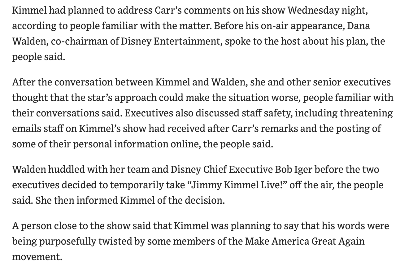 WSJ reports Jimmy Kimmel planned to address the controversy had he gone on air Wednesday night. But Kimmel planned to blame MAGA, and Disney execs feared he would just make things worse.