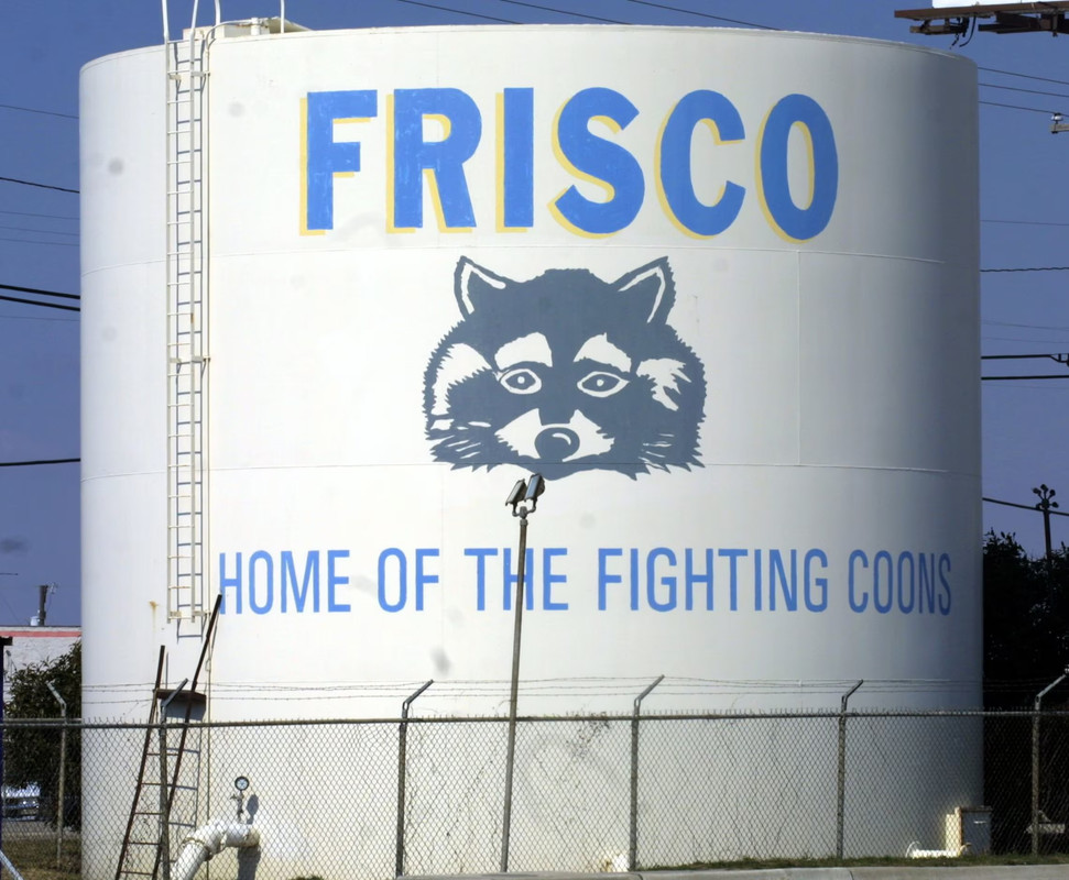 Frisco used to have only one high school and the mascot was the Raccoons. They were known as the Fighting Coons. This is a water storage structure on Preston Rd in Frisco.