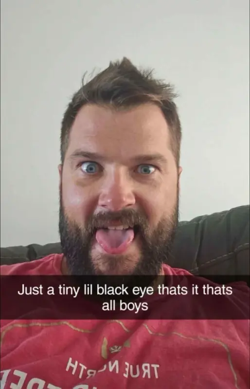 His left eye is definitely sitting a little lower than his right. He almost certainly has an occult orbital floor fracture that he doesn’t know about yet. He needs to see a doctor. Somebody who does the instagram thing needs to tell him.