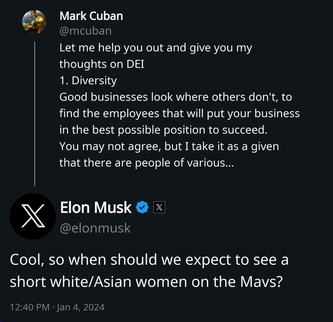 Elon asks M Cuban when 'short white/Asian women' will play for the Mavs due to DEI
