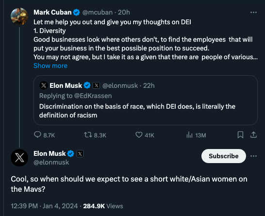 Here was full tweet which Cuban responded to Elon calling out DEI. Then Cuban made his statement which Elin replied to. Cuban is out of his league.