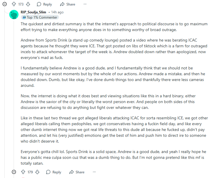 My entire outlook on this incident is that truly, there is really no harm nor foul play here. Andrew is a genuine pillar for the community who stands to gain on uplifting others and protecting his community from threats like ICE, anti-LGBTQIA+ rhetoric, and genuine oppression as a whole. Andrew holds a staggering amount of community driven events outside of his comedy club and as somebody who goes there quite frequently and has interacted with Andrew inside and outside his establishment, he is genuinely not somebody who would go out of their way to commit any "performative activism", nor is he somebody who go out of his way to make a rise out of a situation for attention.