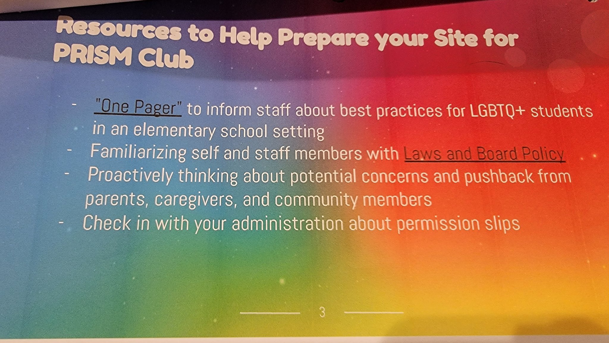 Because we are not official—we have no club rosters, we keep no records,” Buena Vista Middle School teacher and LGBTQ-club leader, Lori Caldeira, states on an audio clip sent to me by a conference attendee. “In fact, sometimes we don’t really want to keep records because if parents get upset that their kids are coming? We’re like, ‘Yeah, I don’t know. Maybe they came?”
