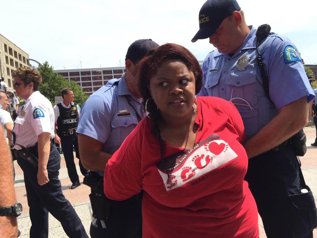 Arrests now. Protest leader @deray just got taken into custody. #FergusonAction
