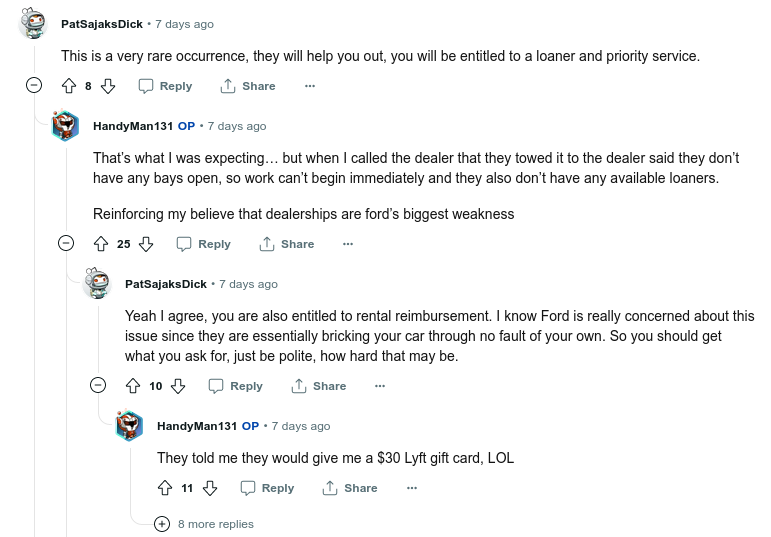 They're so concerned about this issue that they didn't even bother telling dealerships they should make it a top priority and that they must provide a loaner/rental reimbursement without the driver having to contact Ford directly.