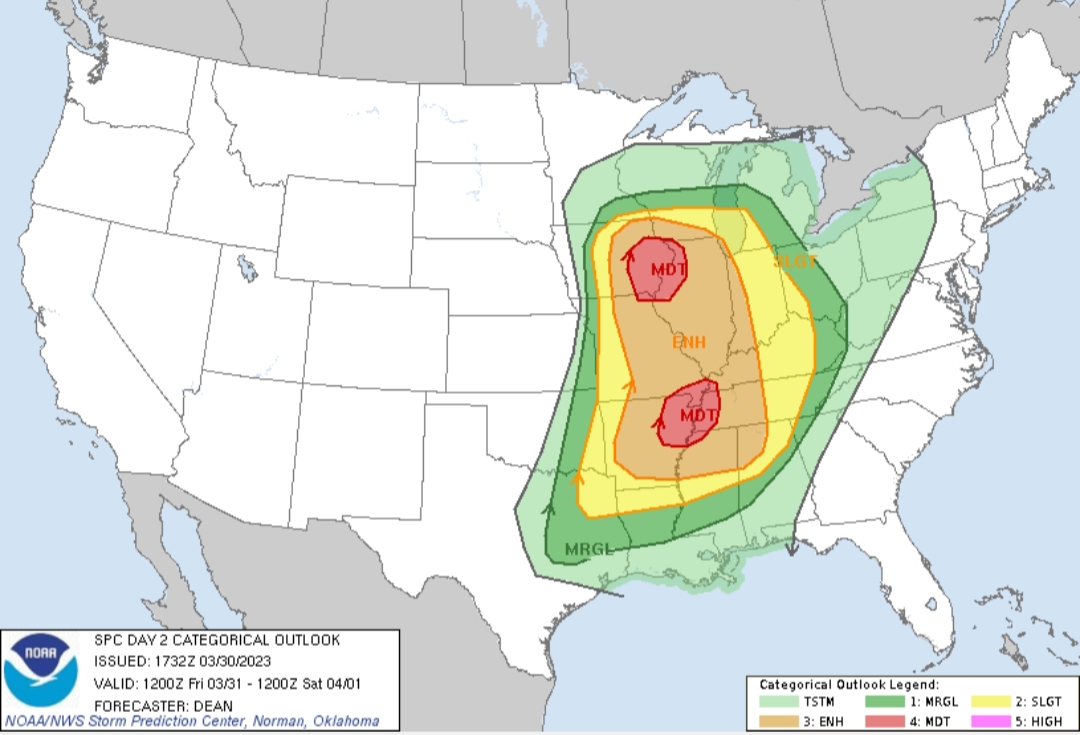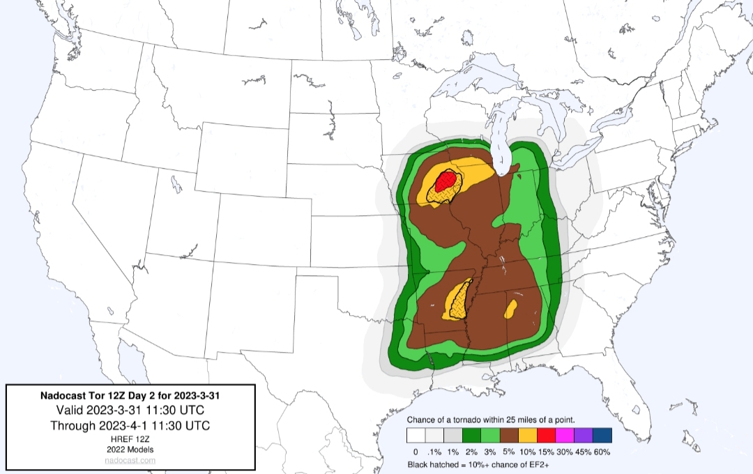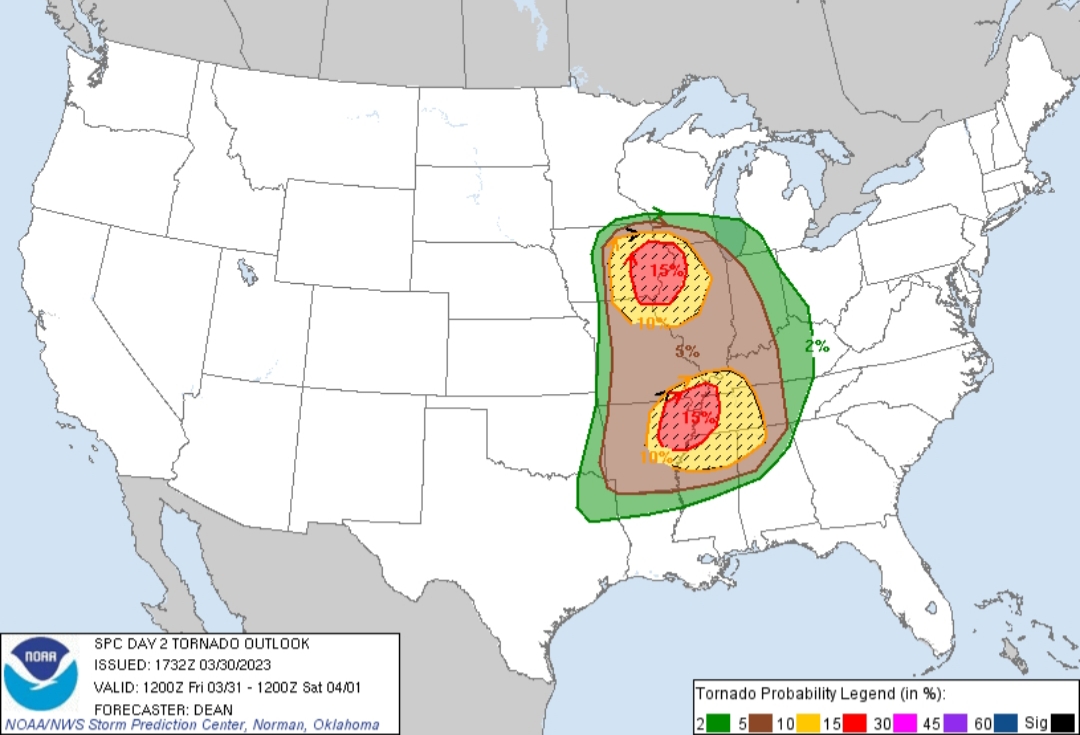 SPC tornado probabilities currently run: 2% (marginal), 5% (slight), 10% (enhanced), 15% (moderate), 30% (high if hatched), 45% (high), 60% (high).