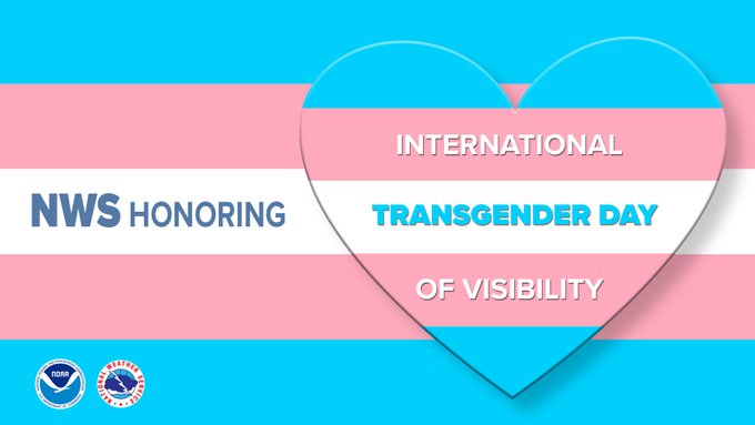 To promote justice, equality, and equity for the transgender community, the National Weather Service family champions and stands alongside our transgender employees on this day and every day! #TransDayOfVisibility