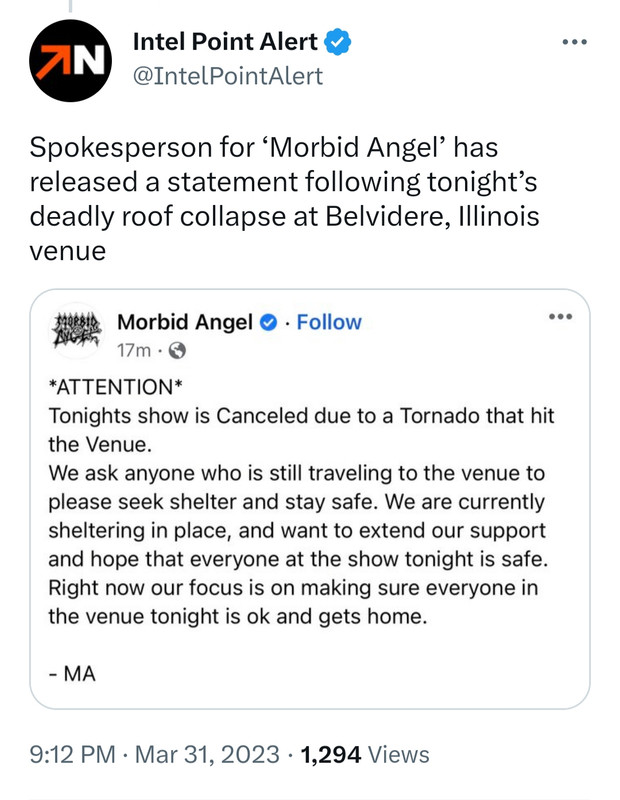 Mass casualty event in Belvidere, IL. Storm caused roof collapse at a concert.