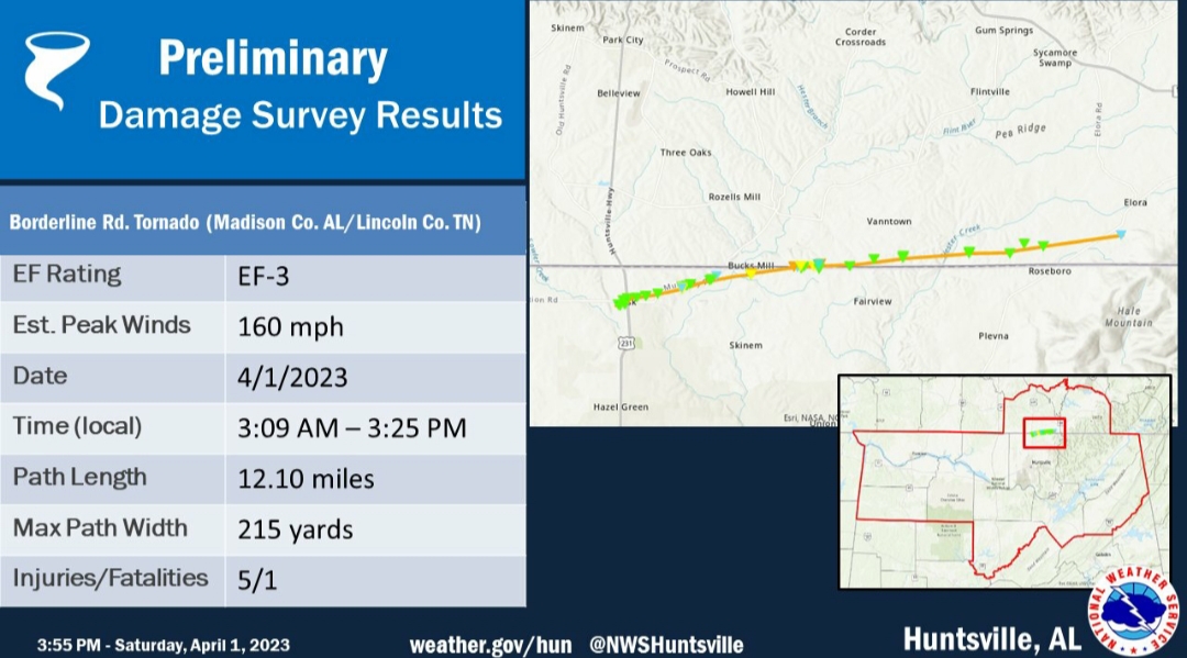 Prelim survey is out for the northern Madison County, AL tornado and it was an EF3.