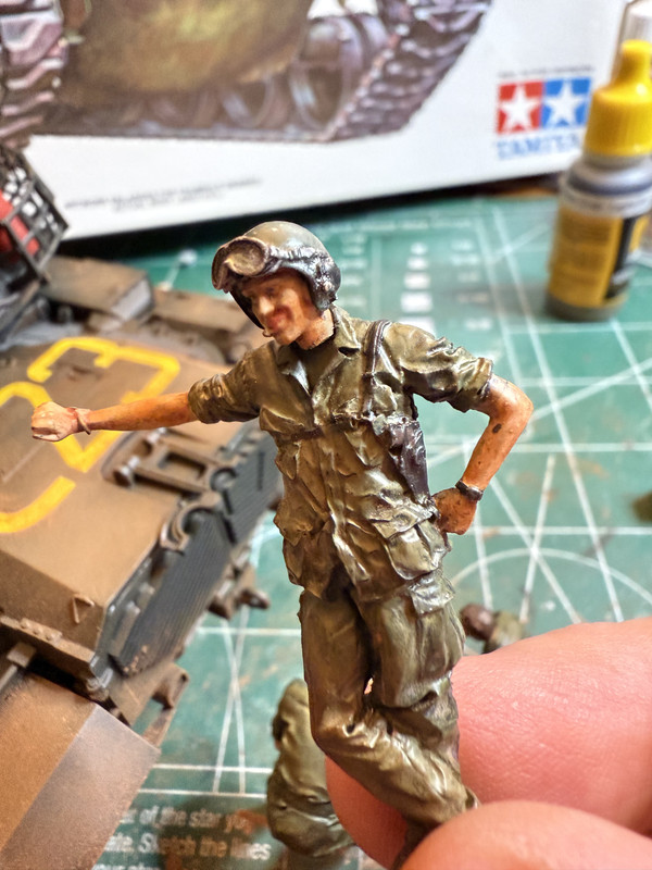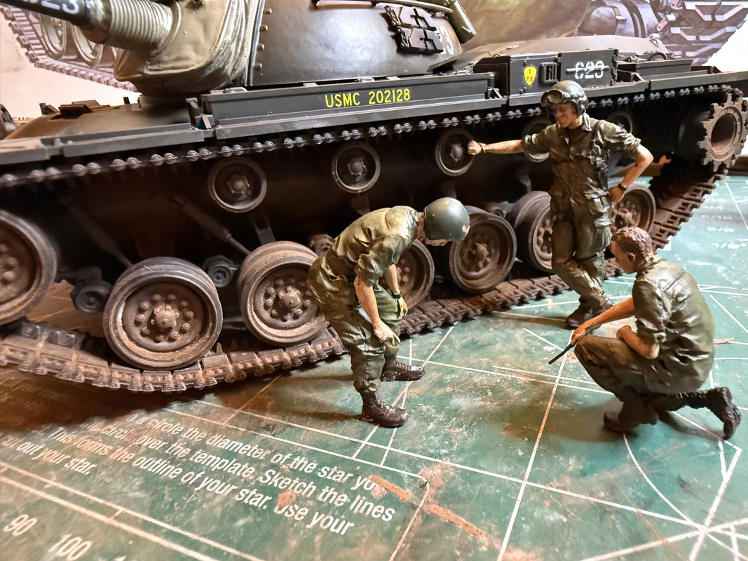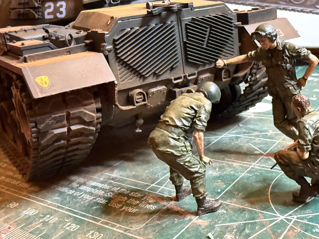 Sorry for the shitty camera work. I did the black basing method - you can see the tonal differences better on the front of the tank, esp the fender area. I didn’t go the oil route for weathering, maybe I should have, though. I couldn’t really find pictures from Vietnam that showed faded paint like that on fighter planes, etc. Most of the weathering on the tank was done using the Vietnam earth/light dust pigments. It’s still a work in progress. The mud (some on the road wheels and under the fenders) was done by globbing oil paint and then covering that with the pigments. Can’t really tell in the pics.
