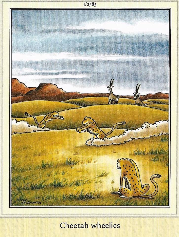 I can’t find it, but I saw my first one on the door to my anthropology professor’s door in college. I think the premise was a primitive comedian responding to a heckler. The comedians comeback was, “ did you walk here tonight or did you brachiate”. So many laugh out loud cartoons, even if I’ve seen them many times.