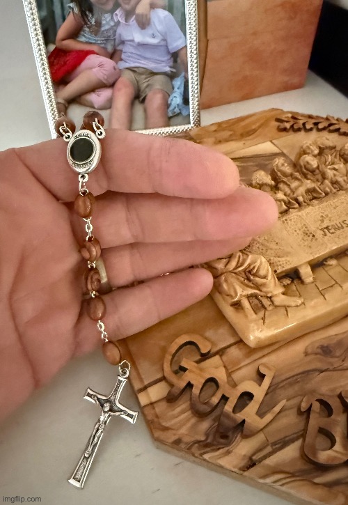 Some holy land peddlers came pass through and I copped a new rosary made with olive wood from Bethlehem me