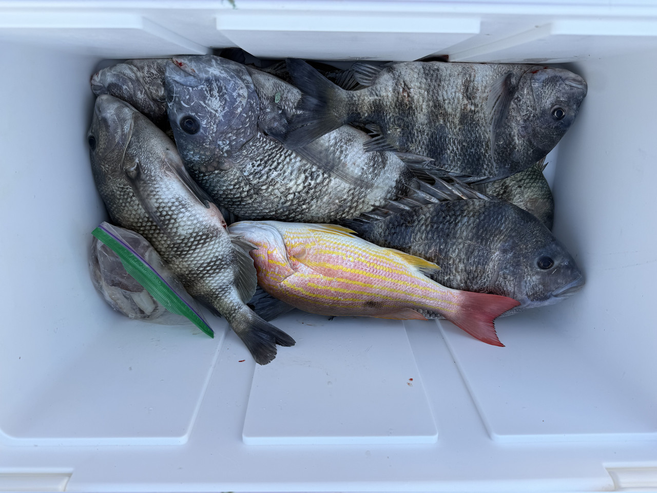 Morning everyone. Front coming through here this morning. Lite showers and cooler. Wind later. Yesterday was a perfect day to go out. We rolled out about 15 miles or so looking for some hog fish. They were hiding from us yesterday. We caught about everything else except hogs. Grouper and snapper were thick but I have plenty of those. I did keep a few Sheeps that we caught on one of the hogfish places. Gonna fillet them up this morning and put them on the flat top tonight.
