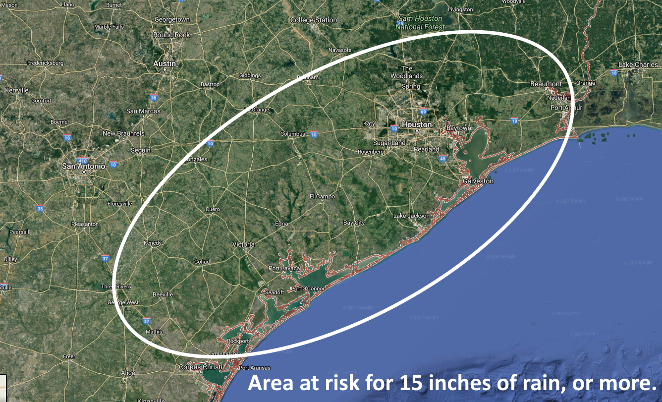As of 6:30am Wednesday, a reconnaissance aircraft is flying around the large area of disturbed weather in the southern Gulf of Mexico, and may find a tropical depression. Some dry air appears to be slowing development right now, but the Gulf is warm and wind shear manageable, so some intensification is likely as the system moves northwest toward Texas during the next couple of days. While we cannot rule out rapid intensification, a phenomenon which is still relatively poorly understood, it is probable that Harvey will come ashore as a tropical storm or Category 1 hurricane. A landfall between Corpus Christi and Matagorda seems most likely at this time. While we may see some storm surges of 3 to 5 feet with such a storm, and tropical storm-force winds, rainfall is by far the biggest concern.