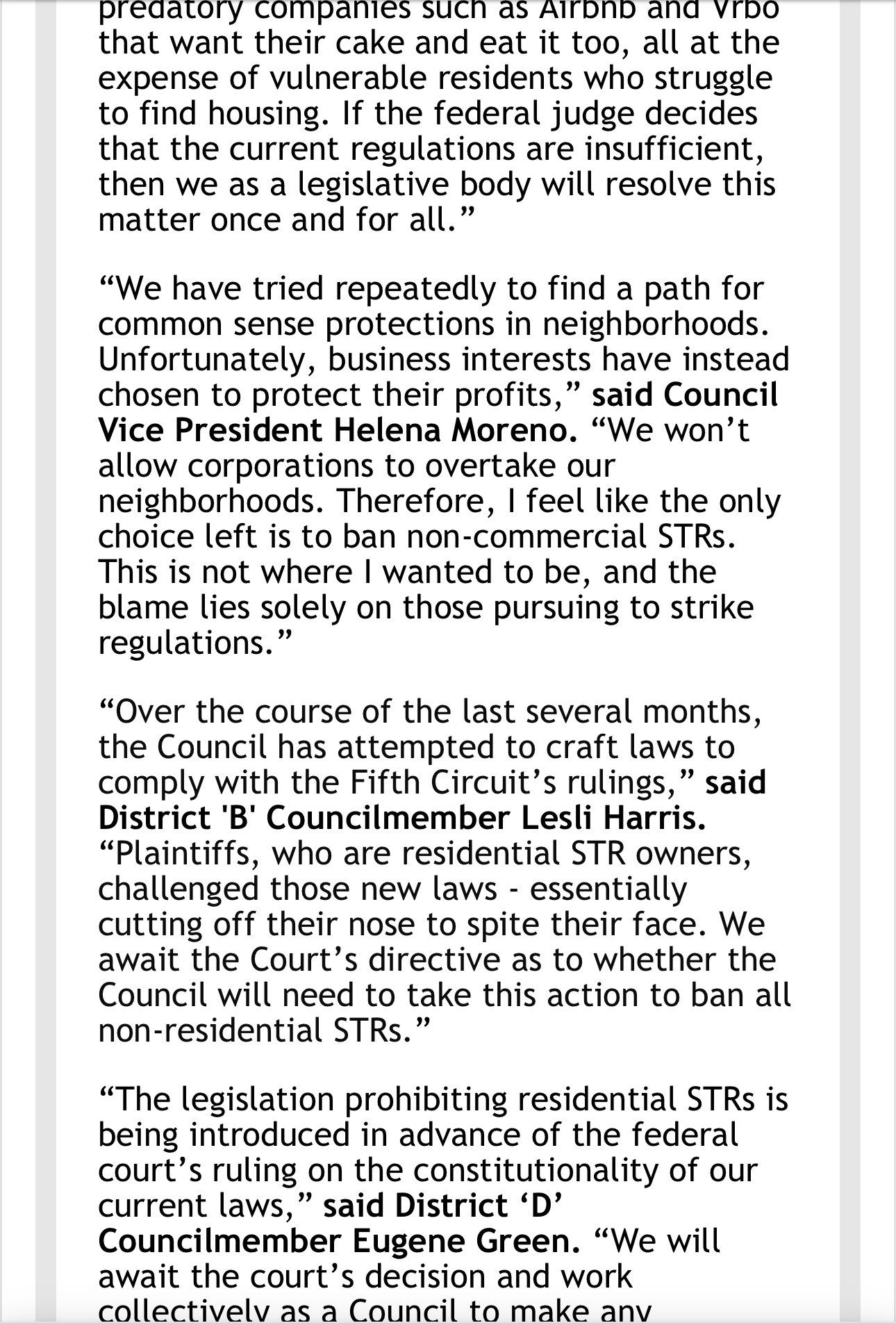 “We won’t allow corporations to overtake our neighborhoods. Therefore, I feel like the only choice left is to ban non-commercial STRs.
